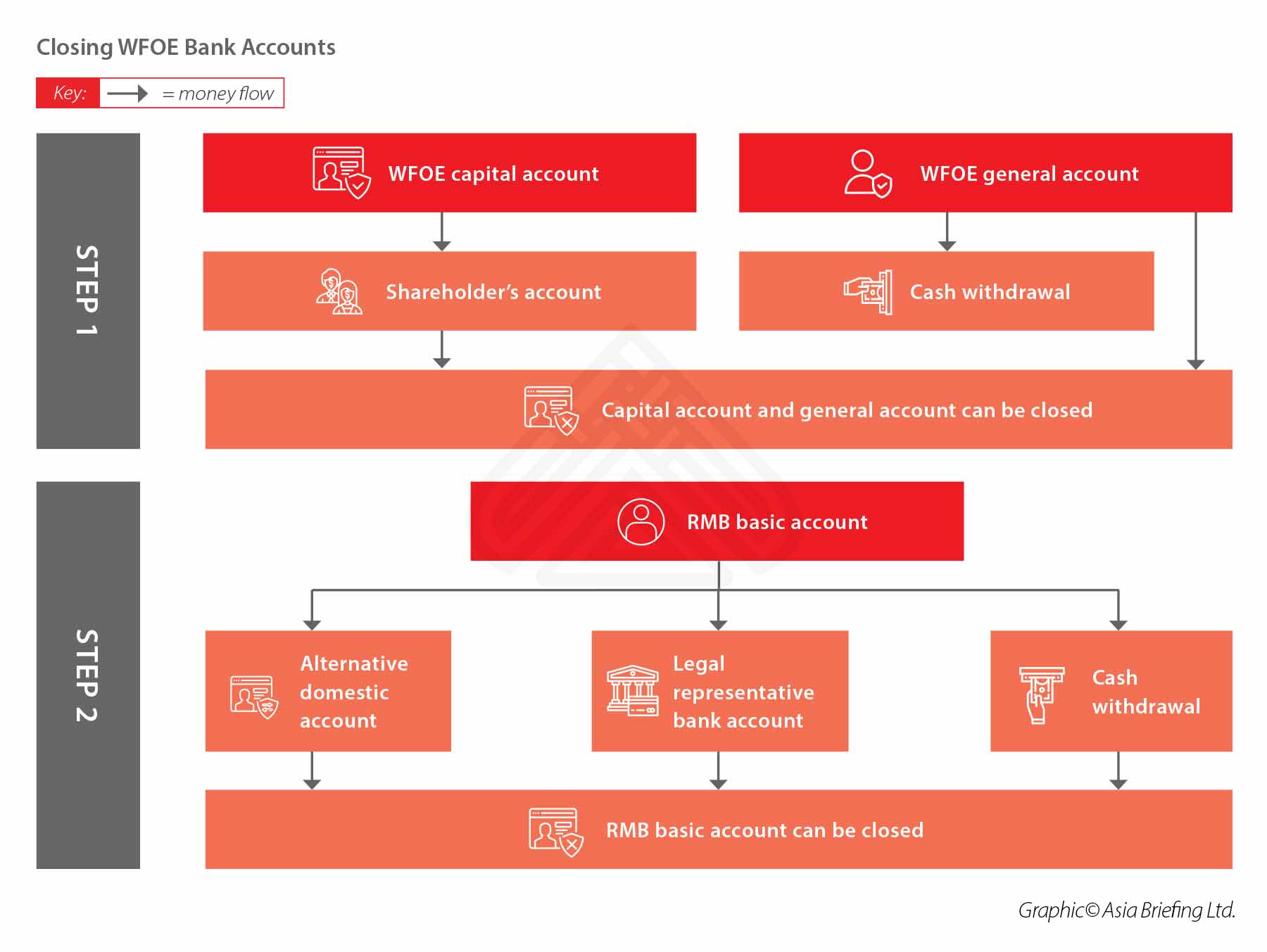 - Foreign Capital Account and RMB general account(s): This shall be conducted together with SAFE deregistration. The balance in foreign capital account and RMB general account(s) shall be transferred to RMB basic account.