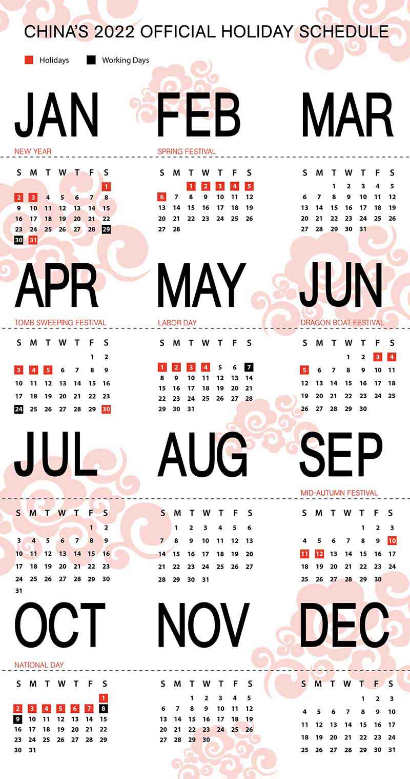 Il Consiglio di Stato cinese ha pubblicato il calendario ufficiale delle festività per il 2022.