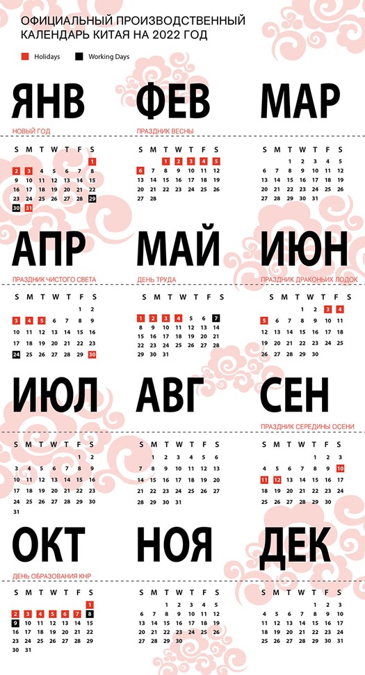 Государственный Совет КНР 22 октября 2022 года опубликовал официальный производственный календарь на 2022 год в Циркуляре Главного управления Государственного совета КНР по организации государственных праздников в 2022 году (здесь приведен официальный источник).